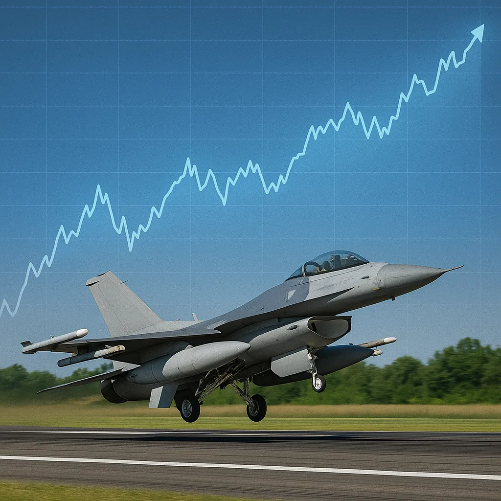 이륙 중인 전투기 위로 주식 그래프가 겹쳐진 장면미국 국방부 건물 위에 록히드마틴 로고와 ETF 그래프가 떠 있는 장면