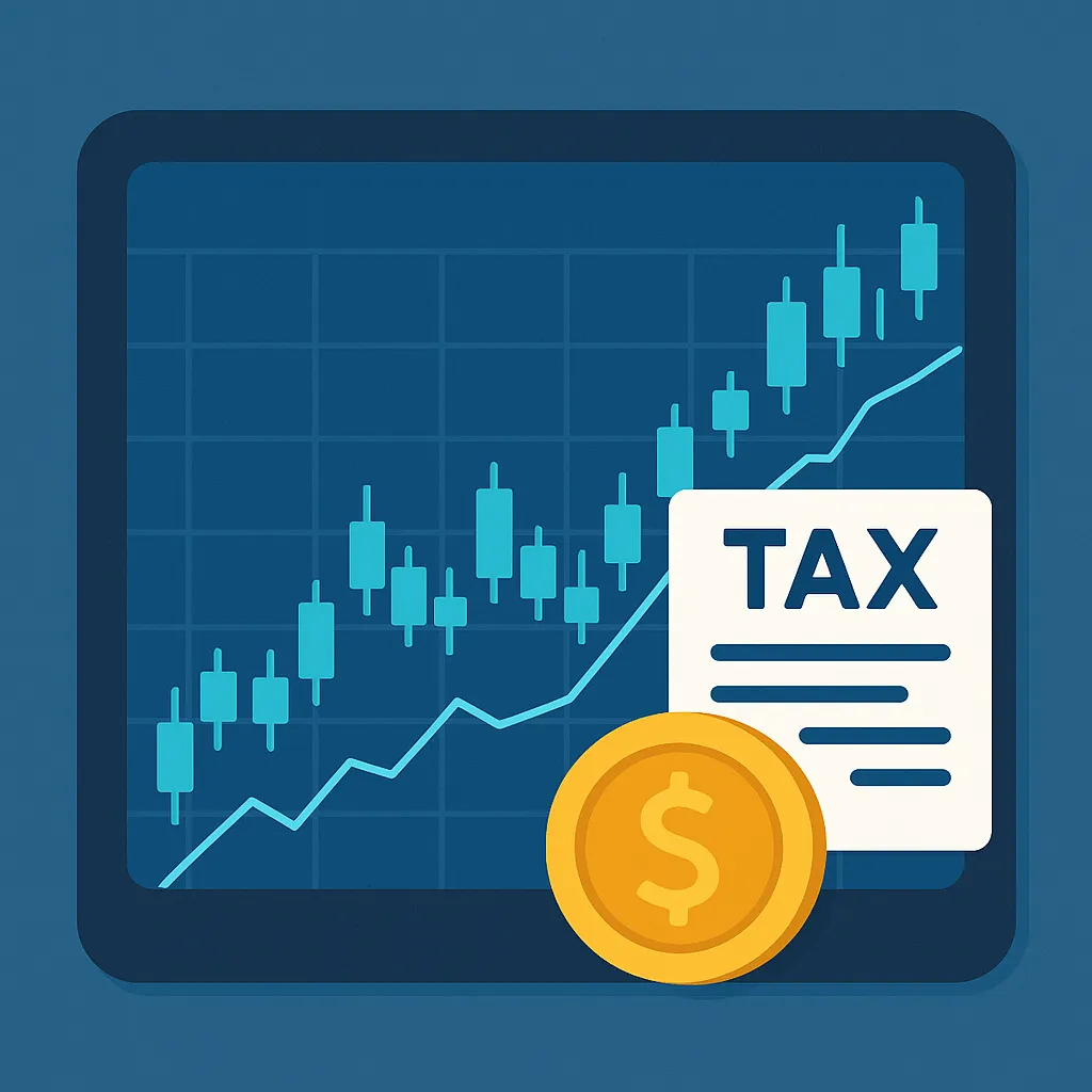 연말정산 서류와 계산기가 책상 위에 놓인 모습주식 그래프와 세금 아이콘이 함께 있는 디지털 화면